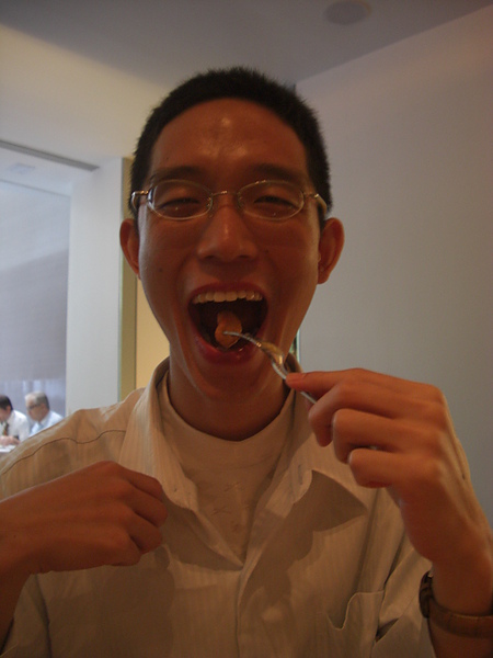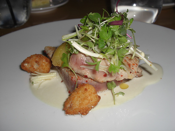 Grilled Yellowfin Tuna 不曉得哪根筋錯了,想說平常只能吃鮪魚罐頭,好像沒吃過真的鮪魚,結果是表面煎的半熟的生魚片嘛! 我又不是生魚片迷。旁邊是煎牛肝,吃好多內臟啊!早知道就堅持點燉兔子了(Saffron Tagliatelle)