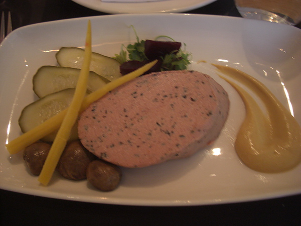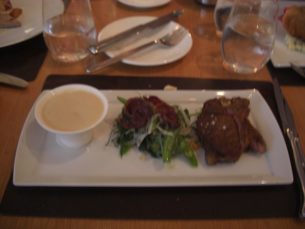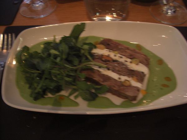Warm Lamb and Goat Cheese Terrine 我的相機性能不好,光線一弱就不會對焦了。Goat Cheese 和羊肉的味道不會太衝,吃起來很順口,點的人不是很滿意,所以我吃了不少。