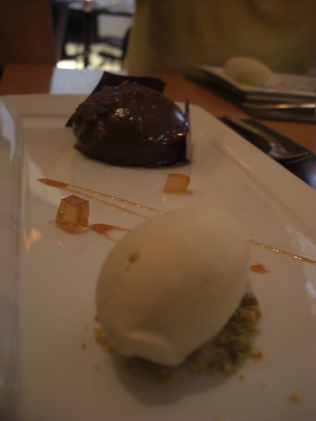 Pistachio Dark Chocolate Dome 那個 Chocolate Dome 切開有三層,上下兩層巧克力蛋糕夾著開心果慕斯,我不是太鍾愛巧克力,嫌它掩蓋了開心果的風采。這個又比我的好吃了。忘了拍我的甜點 Hazelnut Dacquoise :兩片巧克力夾著巧克力奶油放在蛋糕上。chantilly 是種甜酒,但我嘗不出酒的味道。