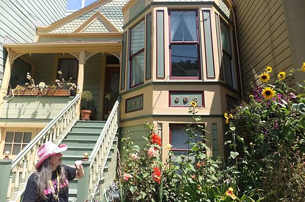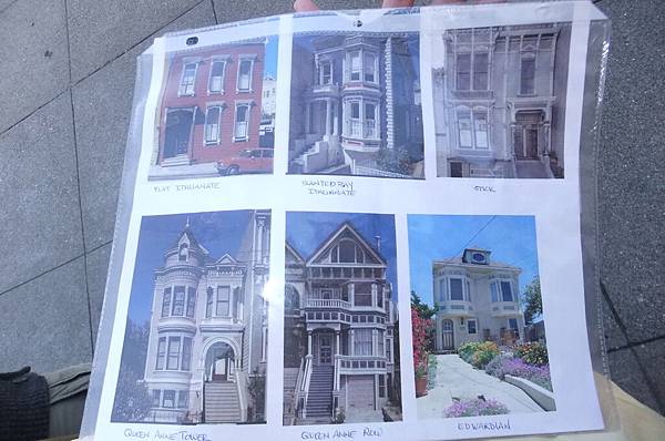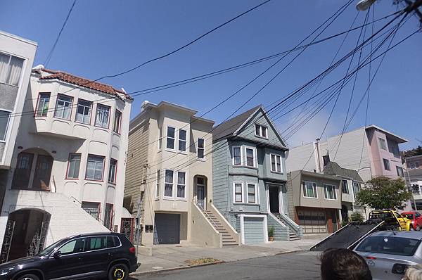 彩虹旗原先設計有八種顏色,各有不同含意,後來為了大量印製,把比較貴的粉紅色和深藍色丟掉就變成現在看到的六色彩虹旗。Karen 是我們的導覽,一開始她就大方介紹自己是 bisexual, 我聽了覺得很高興,能跟 bisexual 接觸是很難得的經驗。 我們先從 Castro 後方的安靜社區逛起,San Francisco 以維多利亞時期的建築著稱,在 Castro 可以看得很清楚。
