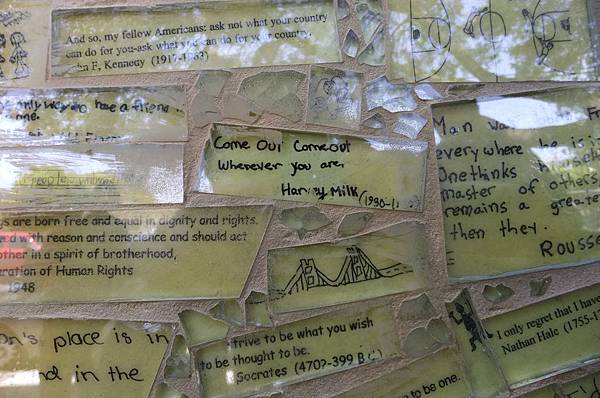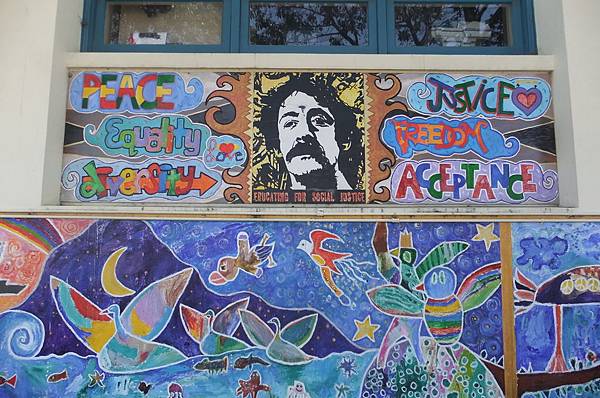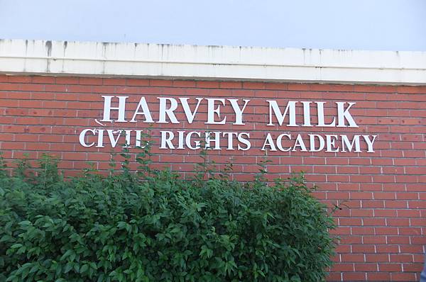 Harvey Milk 成立的學校,牆上有 Harvey Milk 年輕時的畫像、鑲嵌玻璃以及小學生們精選"我最喜歡的名人佳句"